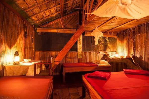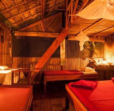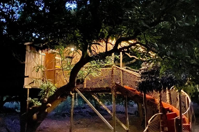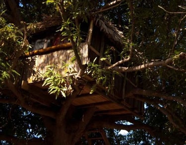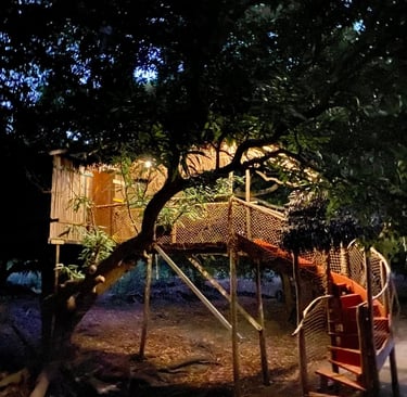 Nous avons 4 cabanes dans les Arbres avec sanitaires communs en bas